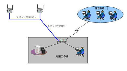 2、每個地面無線網(wǎng)絡(luò)基站內(nèi)放置: 無線AP 外接全向天線 多模光纖收發(fā)器 3、地面工作站交換機連接內(nèi)部管理系統(tǒng)網(wǎng)絡(luò)。