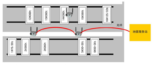 說明: 1、2個地面無線網(wǎng)絡(luò)基站安裝在起重機大車跨的左右兩端中間位置,通過光纖連接連接到地面工作站交換機。 下圖為一個無線基站布置示意圖: